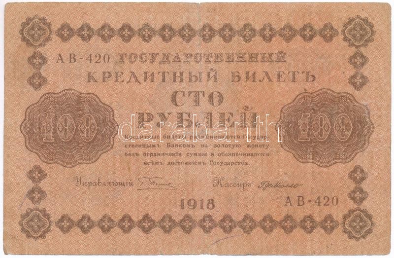 Szocialista Szövetségi Szovjet Köztársaság 1918. 100R T:III hajtás men... https://www.darabanth.com/en/358-Online-auction/358.0/Numismatics/Worldwide-banknotes~2000012/Szocialista-Szovetsegi-Szovjet-Koztarsasag-1918-100R-TIII-hajtas-menten-szakadas-Russian-~II2057744