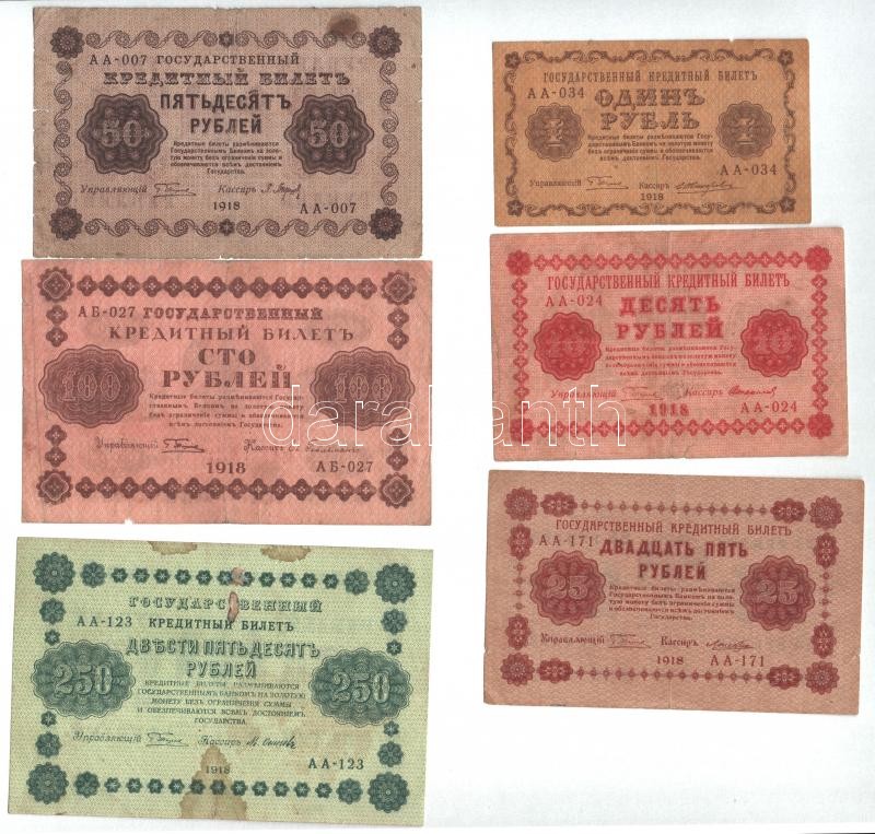 Russian Socialist Federated Soviet Republic 1918. 1 Ruble - 1000 Rubles (8xdiff) C:F-VG pin hole, tear, stained