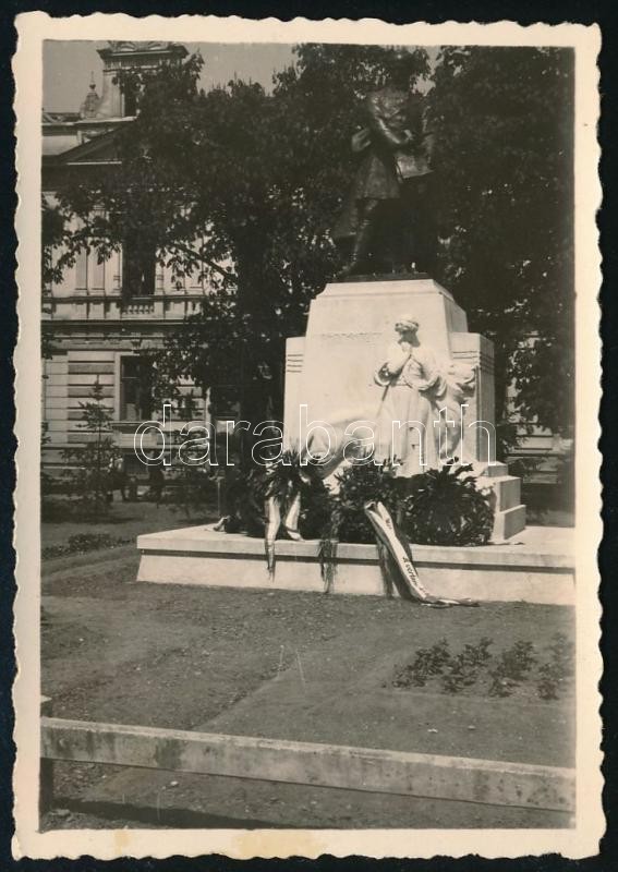 1942 Nagyvárad, A Szacsvay-szobor nemzeti színű szalagos koszorúkkal, ...