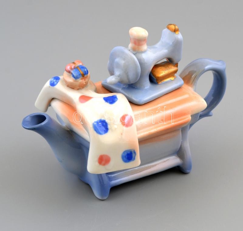 Porcelán varrógépes kiöntő, kézzel festett, jelzés nélkül, kis kopásnyomokkal, 14×9×8 cm