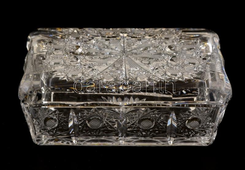 Ólomkristály üvegdoboz, metszett, kis hibával, karcolással, 12×8×5 cm
