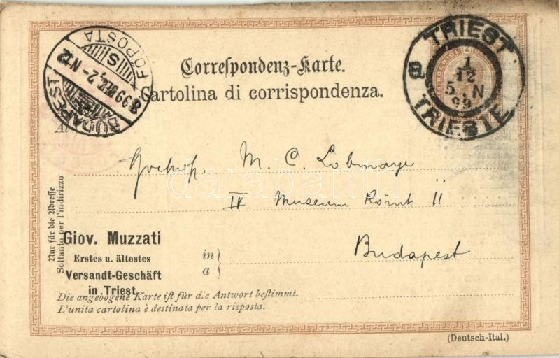 1899 Giov. Muzzati Erstes u. ältestes (1873) Versandt Geschäft Triest / advertisement card of Giovanni Muzzati's shop in Trieste (vágott / cut)