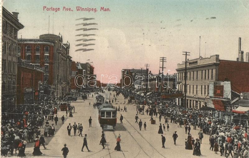 Winnipeg, Portage Avenue, tram, shops (from postcard booklet) (EK)