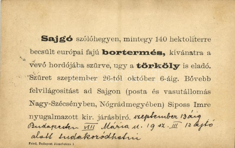 1901 Szécsény, Siposs Imre féle Sajgó szőlőhegyi bortermés reklámja