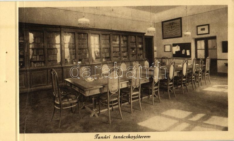 Description: Budapest I. M. Kir. Ferenc József Nevelőintézet egyetemi katolikus reálgimnáziuma, tanári tanácskozóterem, belső. Goszleth udvari fényképész felvétele. Ilona utca 4. (ma Szabó Ilonka utca) - képeslapfüzetből / from postcard booklet (b)