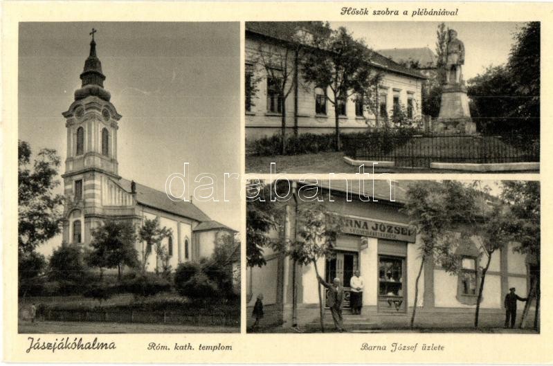 Jászjákóhalma, Római katolikus templom, Hősök szobra a plébániával, emlékmű, Barna József üzlete és saját kiadása