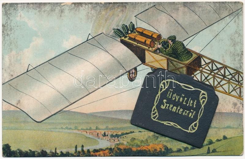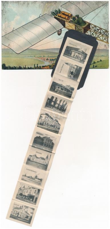 Description: Szentes, repülőgépes leporellólap, benne vasútállomás és vendéglő, kültelki szélmalmok, Szilágyi Dezső üzlete és kereskedelmi bank stb. / leporellocard with aircraft