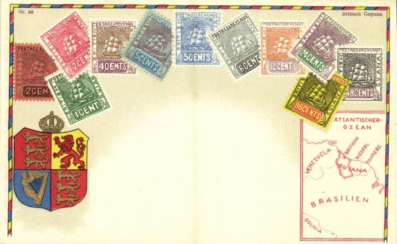 British Guiana / Stamps, coat of arms and map of Guyana. Carte Philatelique Ottmar Zieher No. 86. litho