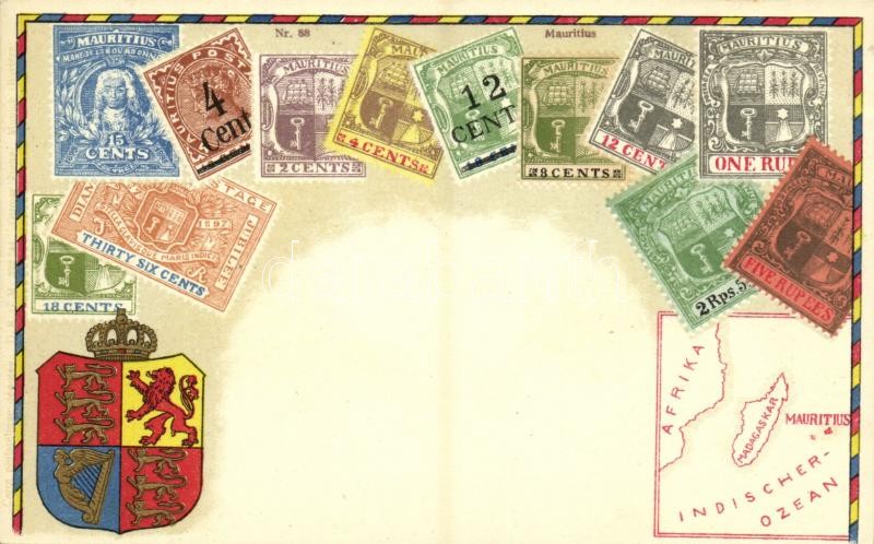 Mauritius / Stamps, coat of arms and map of Mauritius. Carte Philatelique Ottmar Zieher No. 88. litho