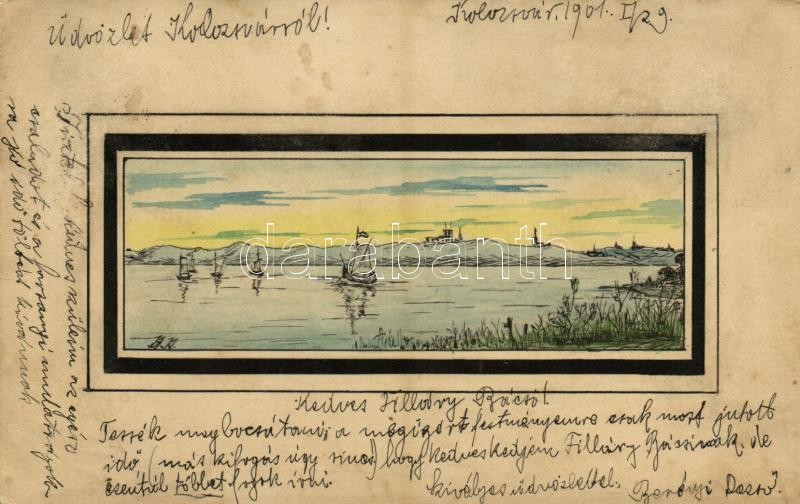 1901 Kolozsvár, Cluj; kézzel rajzolt és színezett művészlap / hand-dra...
