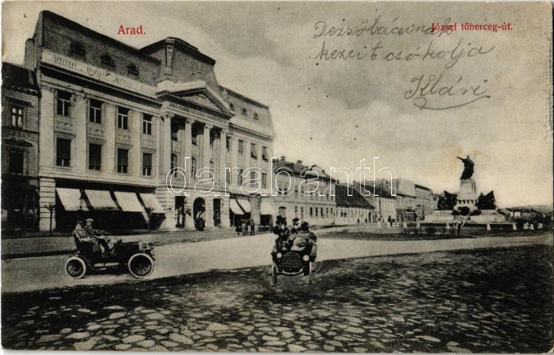 1918 Arad, József főherceg út, Arad-Csanádi Gazdasági Takarékpénztár, automobilos montázs / street view, savings bank, automobile montage