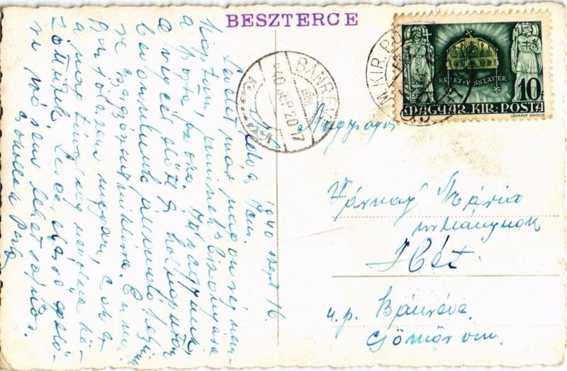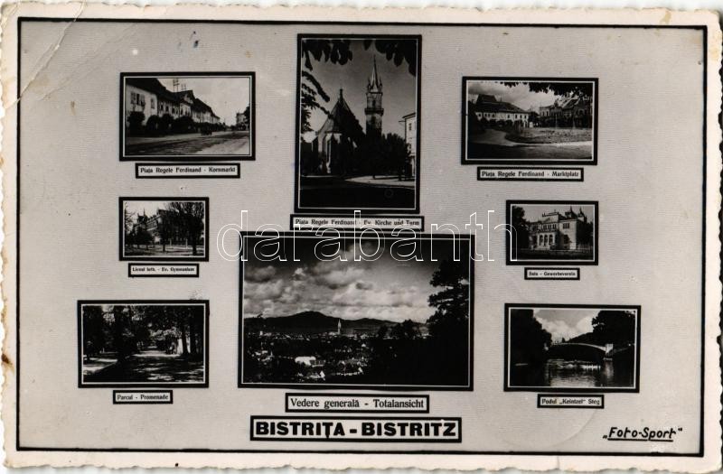 1940 Beszterce, Bistritz, Bistrita; Piata Regele Ferdinand, Sala, Liceul luth., Parcul, Podul "Keintzel" Steg, Vedere generala / Kornmarkt, Ev. Kirche und Turm, Marktplatz, Gewerbeverein, Promenade, Ev. Gymnasium, Totalansicht / Evangélikus templom és torony, Piactér, Iparosegylet háza, tó, sétány, látkép / Lutheran church and tower, market square, House of Craftsmen Association, lake, promenade, general view. Foto-Sport + M. kir. posta 117. bélyegző (EB)
