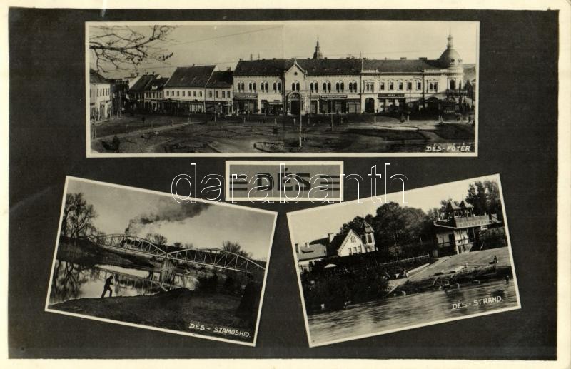 1944 Dés, Dej; Fő tér, Szigyártó Sámuel, Biró üzlete, Szamos híd, strand, fürdőzők / main square, shops, Somes river bridge, beach, bathers