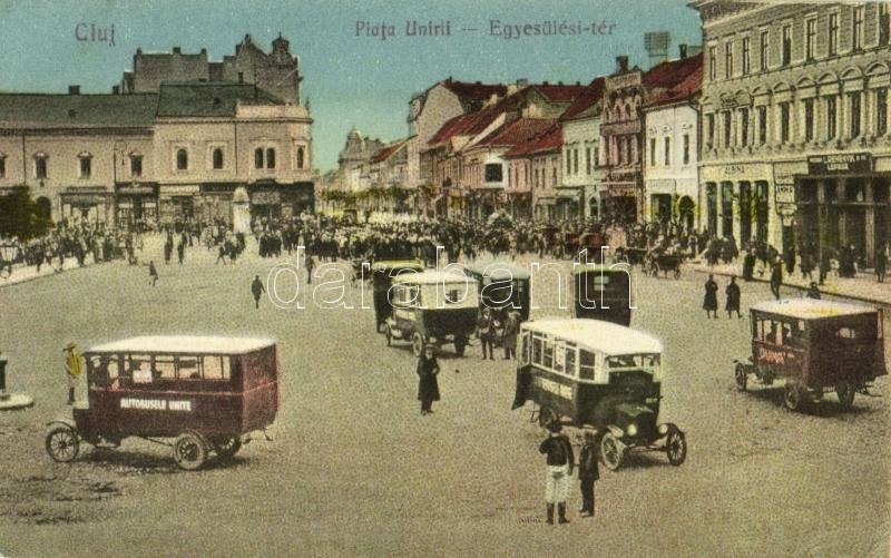 Kolozsvár, Cluj; Piata Unirii / Egyesülési tér, autóbuszok, L. Reményi...