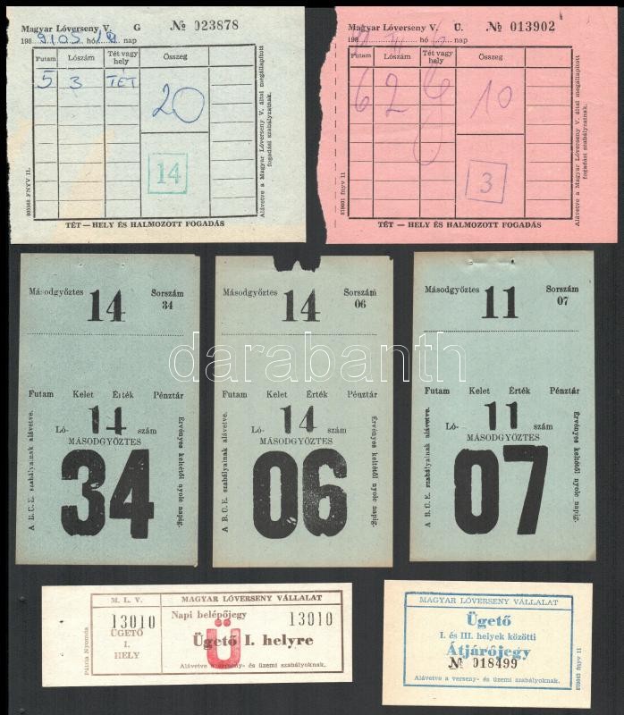 14 db lóversenyzéssel kapcsolatos fogadójegy, stb.