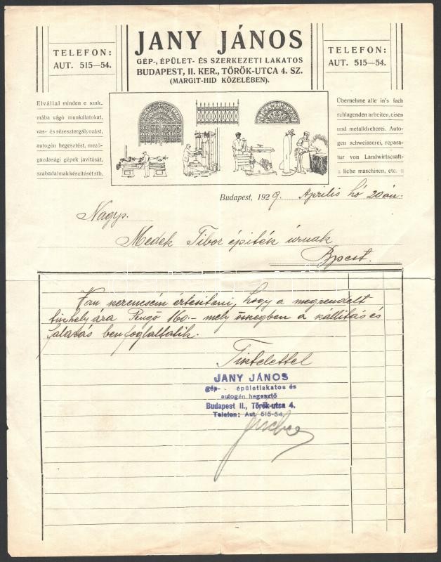 1929 Bp.II., Jany János Gép-, Épület és Szerkezeti Lakatos díszes fejl...