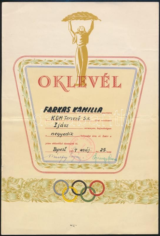 1957 Bp., Íjásznő oklevele olimpiai jelképpel