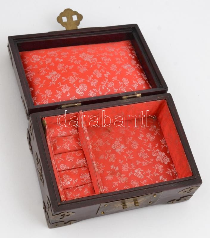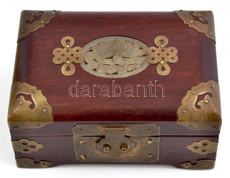 Kínai ékszertartó fa doboz, réz rátétetekkel, faragott jáde? berakással, 17×11 cm, m: 8 cm