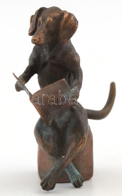 Olvasó kutya, bronz figura, jelzett, m: 4,5 cm