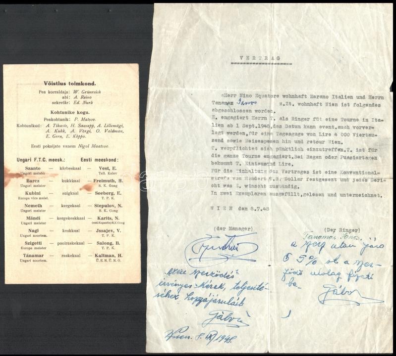 cca 1937-1948 Tanamár János bokszoló német nyelvű szerződése + 2 db nyomtatvány