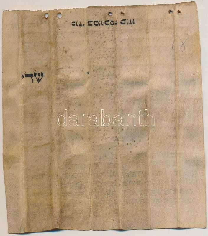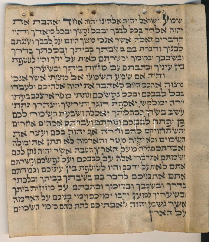 cca 1800-1900(?) Mezuzatekercs (MTörv 6,4-9 és 11,13-21), kézzel írt, pergamen, 12,5×11 cm / cca 1800-1900(?), Mezuza scroll (Deut 6,4-9 and 11,13-21), handwritten, parchment, 12,5×11 cm