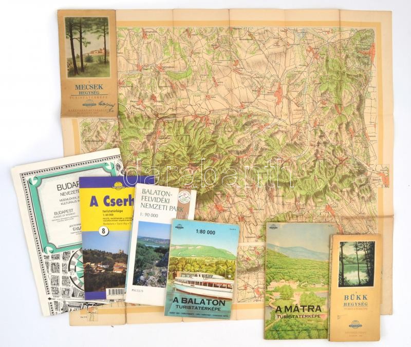 Description: cca 1950-2000 Vegyes térkép tétel, 7 db, Budapest nevezetességei, Balaton-Felvidéki Nemzeti Park, Bükk, Mecsek, Cserhát..stb. Különféle méretben, változó állapotban.