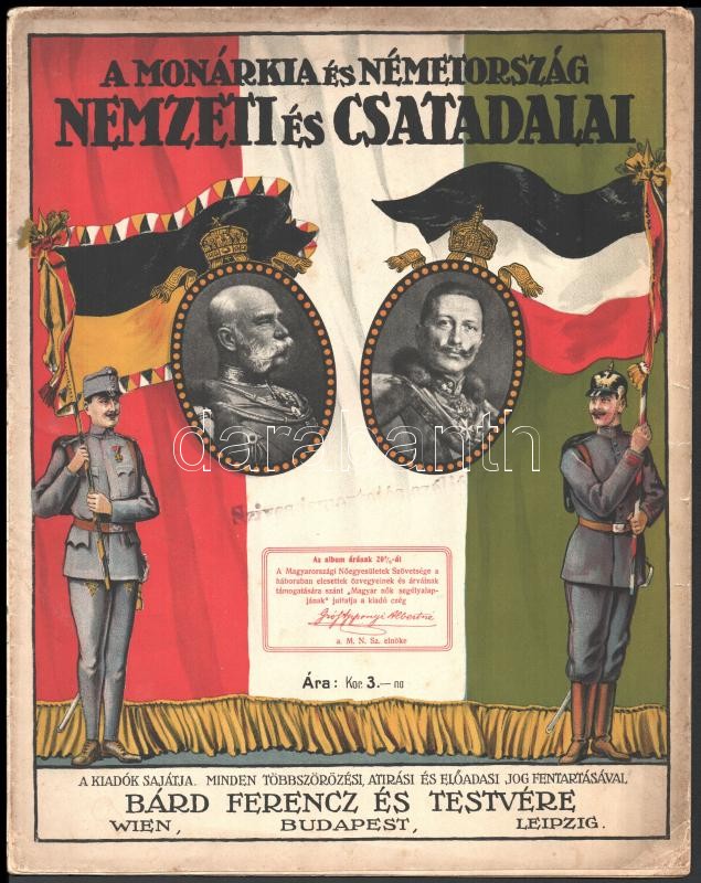 Description: cca 1914-1918 A Monárkia és Németország Nemzeti és Csatadalai. Bp.,én.,Bárd Ferenc és Testvére, 18 p. Kotta. Kiadói színes, illusztrált, I. Ferenc József császár és király és II. Vilmos császár arcképeivel díszített papírkötésben, a borító szélén folttal, a kotta teste elvált a borítótól. 'Az album árának 20%-át a "Magyar nők segélyalapjának" juttatja a kiadó cég." bélyegzéssel.
