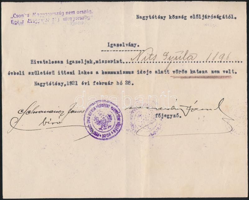 https://www.darabanth.com/en/359-Online-auction/359.0/Art-and-other-collectibles/Printed-Materials~500030/1921-Nagyteteny-kozsegi-eloljarosag-altal-kiallitott-igazolvany-irredenta-jelmondattal~II2065194
