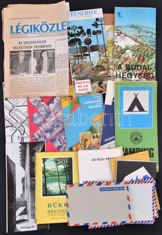 Description: cca 1960-1980 Vegyes papírrégiség tétel, közte térképek (16 db), Légiközlekedés XIII. évf. 13 sz., régi képeslapok, használatlan légipostás borítékok, repülőjegy és beszállókártya.