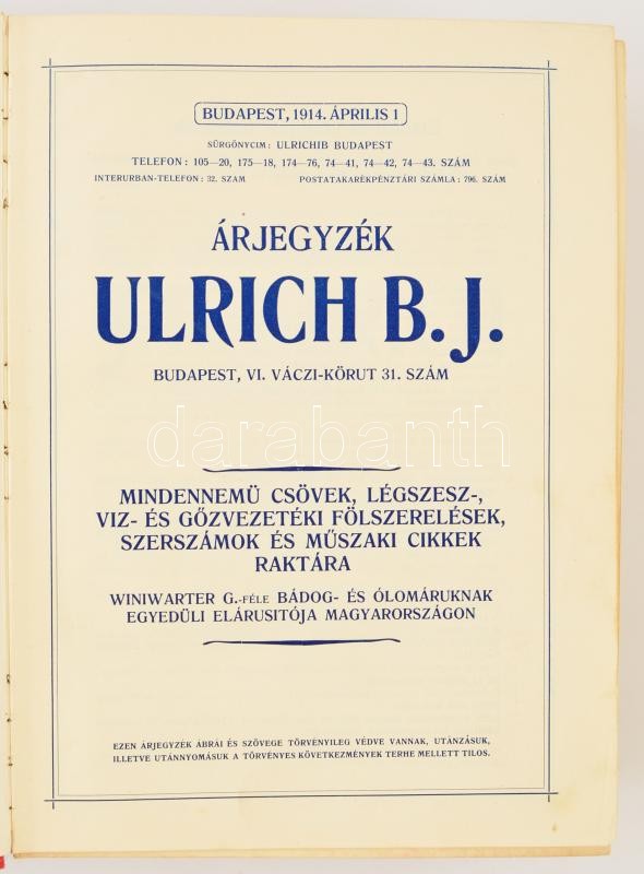 1914. Ulrich B.J. Légszesz, csövek és berendezések vastag, képes termékkatalógus 1360p. Sérült egészvászon kötésben