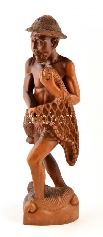 Távol keleti halász, faragott fa figura, jelzés nélkül, m:59 cm