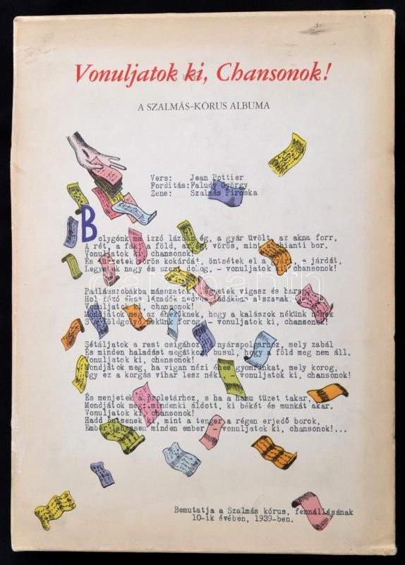 Description: Pécsi Antal (szerk.) Vonuljatok ki, Chansonok! (A Szalmás-kórus albuma) Bp., 1970. Zeneműkiadó. Sorszámozott 116/150. Egészbőr kötésben, illusztrált tékában, kísérőlevéllel. Jó állapotban