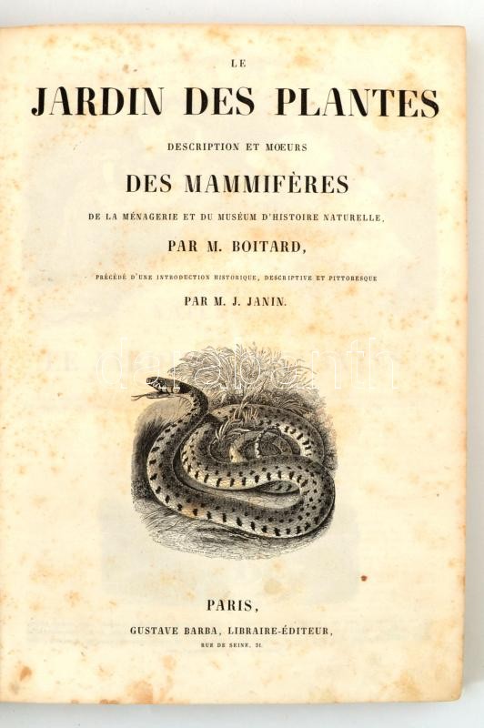 Boitard, M. - M. J. Janin: Le jardin des plantes. Description et moeur... https://www.darabanth.com/en/359-Online-auction/359.0/Books/Books-Gastronomy-and-Gardening~1500011/Boitard-M-M-J-Janin-Le-jardin-des-plantes-Description-et-moeurs-des-mammiferes-de-la-menage~II2064342