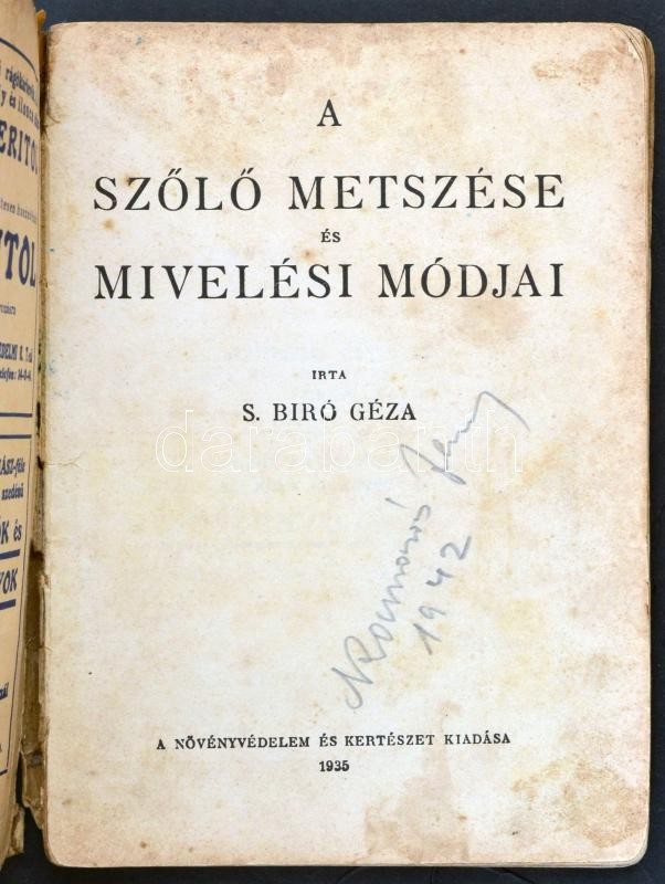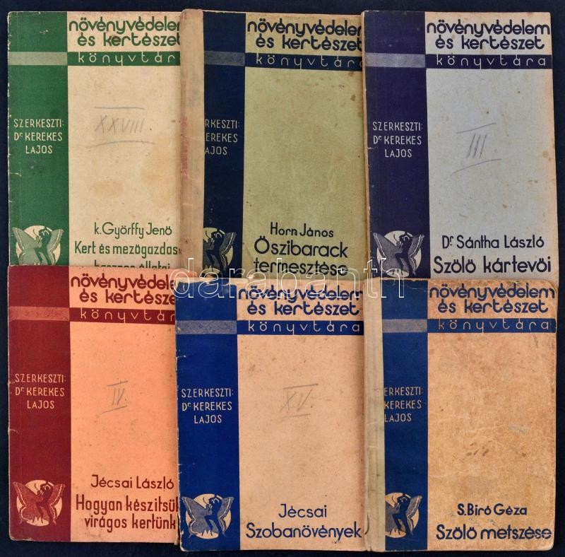 K. Györffy Jenő: Kert- és mezőgazdaság hasznos állatai.; Horn János: Őszibarack termesztése.; Dr. Sántha László: Szőlő kártevői.; Jécsai László: Hogyan készítsük el a virágos kertünket.; Jécsai László: Szabanövények.; S. Biró Géza: Szőlő metszése. Bp.,1934-1942, Növényvédelem és Kertészet. Kiadói papírkötés, változó állapotban, nagyrészt kopott borítókkal, kettő gerince javított, egy borítója kissé szakadozott.