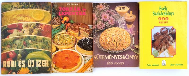 Péter Jánosné-Nagy Sándorné: Esély szakácskönyv. 999 recept. Bp.,1996, Esély. Kiadói papírkötés. +Süteményes-könyv. Péter Jánosné gyűjtése. 800 recept. Bp., 1987, (Szikra-ny.) Kiadói papírkötés. + Régi és új ízek. Változatlan utánnyomás. Összeáll.: F. Nagy Angéla. Bp.,1984, Magyar Nők Országos Tanácsa-Kossuth. Kiadói papírkötés.+Charlotte Cortinovits-Josiane Syren: Torták és lepények. Sós és Édes. Bp., 1996, Delta 2000. Kiadói papírkötés.