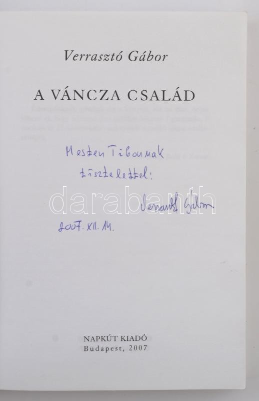 Verrasztó Gábor: A Váncza család. Bp.,2007, Napkút. Feket-fehér és színes képanyaggal illusztrált. Kiadói papírkötés. A szerző által dedikált!