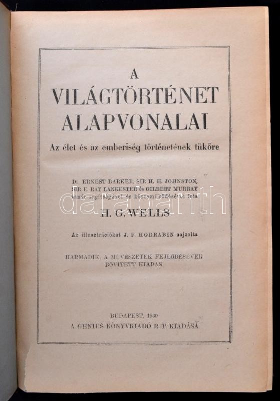 Description: H.G. Wells: A világtörténet alapvonalai. Az élet és az emberiség történetének tüköre. J. F. Horrabin rajzaival. Bp., 1930, Genius Könyvkiadó Rt. Harmadik, a művészetek fejlődésével bővített kiadás. Kiadói aranyozott egészvászon kötés, kissé kopott borítóval, a címlapon szakadással.
