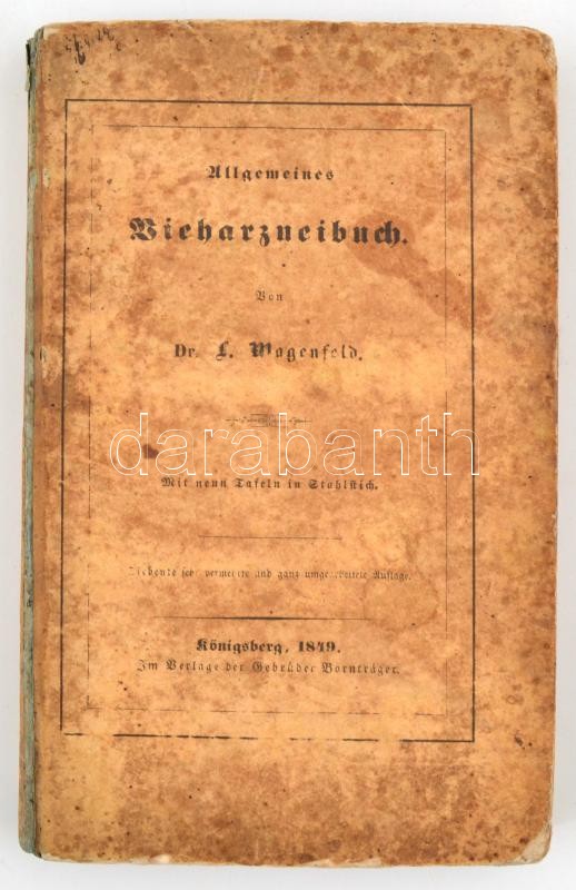 Dr L Wagenfeld: Allgemeines Vieharzneibuch. Königsberg, 1849. Gebr. B... https://www.darabanth.com/en/359-Online-auction/359.0/Books/Books-Natural-sciences-Medicine~1500013/Dr-L-Wagenfeld-Allgemeines-Vieharzneibuch-Konigsberg-1849-Gebr-Borntrager-Haziallatok-es~II2062435
