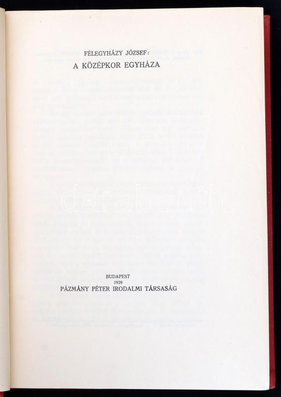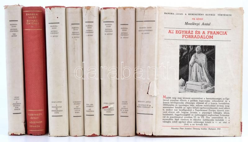 Bangha Béla - Ijjas Antal: A keresztény egyház története. 1-8. köt. Szerk-- Bp., 1937-1941. Pázmány Péter Irodalmi Társ. (Korda Rt. ny.). 1. Bangha Béla - Borbély Sándor: Az ősegyház. 303p., 4t. 2. Loschert Kázmér: Az egyházatyák kora. 270,[1]p., 8t. 3. Gálos László: Az egyház és a barbár népek. 320 p., 7t. 4. Félegyházy József: A középkor egyháza. 402p., 6t. 5. Ijjas Antal: A reneszánsz és a hitszakadás kora. 362,[5]p., 4t. 6. Csóka Lajos: A katolikus megújhodás kora. 346,[1]p., 4t. 7. Ijjas Antal: Az egyház és az uralkodói abszolutizmus. 120p., 4t.; Meszlényi Antal: Az egyház a forradalmak korában. 239p., 4t. 8. Ijjas Antal: A jelenkor egyháztörténete. 271p., 6t. Kiadói, egységes, aranyozott gerincű félvászon-kötésben, egy kivételével az eredeti védőborítókkal.. (8 db)