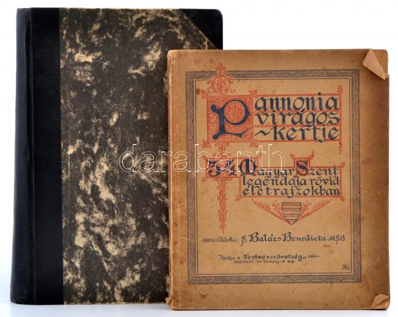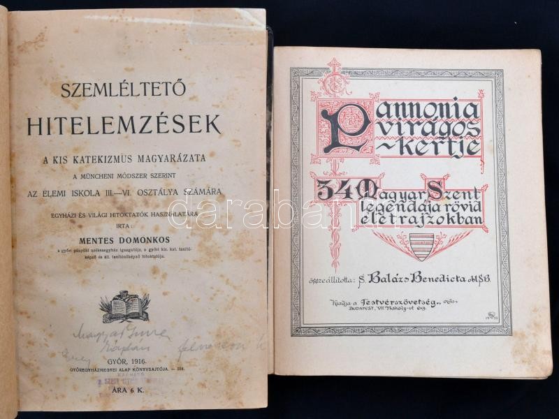 Mentes Domonkos: Szemléltető hitelemzések a kis katekizmus magyarázata a müncheni módszer szerint. Az elemi iskola III-VI. osztálya számára. Egyházi és világi hitoktatók számára. Győr, 1916, Győregyházmegyei Alap Könyvsajtója, XIV+432 p. Kiadói félvászon-kötés.+Pannonia virágos kertje. 34 magyar szent legendája rövid életrajzokban. Összeáll.: Balázs Benedicta. Bp.,1929,Testvér Szövetség. Kiadói papírkötésben, szakadozott gerinccel, kissé foltos borítóval, kijáró lapokkal.