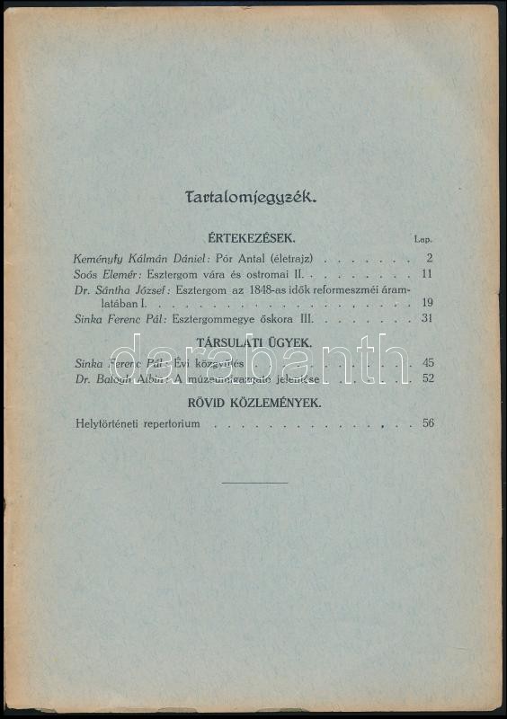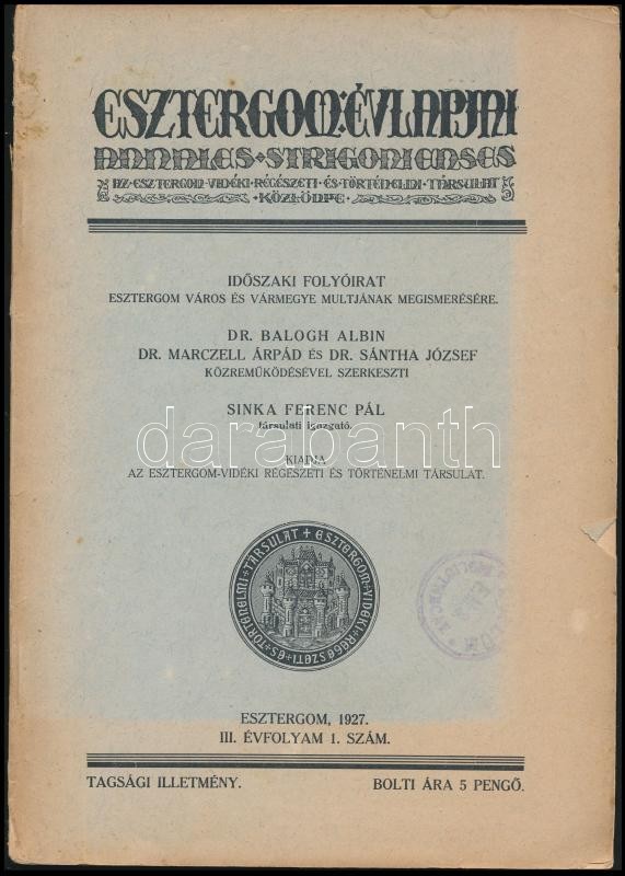 1927 Esztergom évlapjai. (Annales Strigonienses.) Az Esztergom-Vidéki Régészeti és Történelmi Társulat közlönye. III. évf. 1. sz. Esztergom, 1927, Laiszky János, 56 p.+2 t.(Kihajtható táblák.) Papírkötésben, szakadt gerinccel.