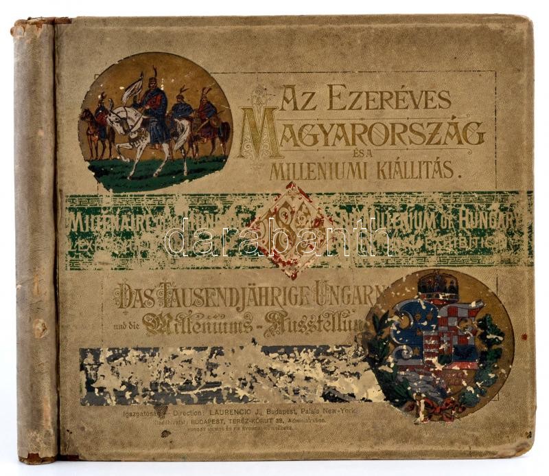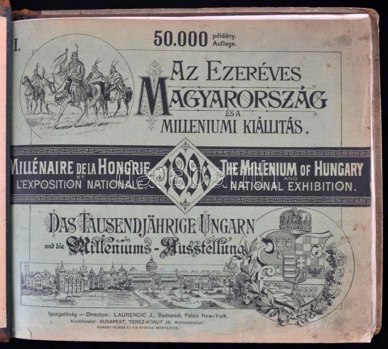 Az ezeréves Magyarország és a Milléniumi Kiállítás. Das 1000 jährige Ungarn und die Millenniums-Austellung. Magyarország legszebb tájainak, városainak és műkincseinek valamint a kiállítás nevezetességeinek fényképgyűjteménye. Részben Vágó Bertalan a M.Á.V. fényképésze. A kereskedelemügyi m. kir. ministerium pártfogása mellett, a m. kir. államvasutak és az ezredéves országos kiállítás igazgatóságának megbízásából és közreműködésével kiadja Laurencic Gyula. Szerkesztik: Piványi Ernő a magyar és német, Timár Szaniszló a magyar, Palóczy Lipót a német, Fouquau Henrik a francia, Steiner Gyula az angol szöveget. [Magyar, német, angol és francia nyelven.] I-XII. Füzet. Bp., 1896. Kunossy Vilmos és Fia, 210 p. Gazdag fekete-fehér képanyaggal illusztrált. Kiadói aranyozott, festett, haránt alakú egészvászon-mappa, kivehető papír füzetekkel, benne díjszelvényekkel, kopott borítóval, sérült gerinccel, egy-két kisebb szakadással, kisebb folttal.