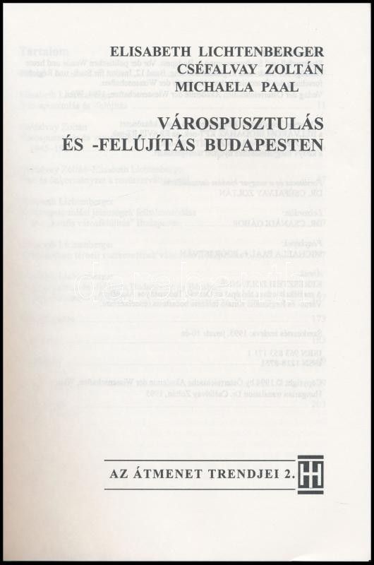 Elisabeth Lichtenberger-Cséfalvay Zoltán-Michaela Paal. Várospusztulás és felújítás Budapesten. Az Átmenet Trendjei 2. Bp., 2005, Magyar Trendkutató Központ. Színes térkép-melléklettel. Kiadói papírkötés.