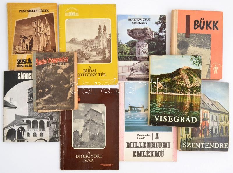 Vegyes útikönyv tétel, 10 db: Cseke László: Visegrád. (1966, Panoráma.), Dr. Boros Lajos-Dr. Soproni Sándor-Szombathy VIktor: Szentendre (1966, Panoráma), Örvös János (szerk.:) Bükk útikalauz (1962, Sport), Détshy Mihály: Sárospatak. (1970, Corvina.), Jávorka Péter: Zsámbék és környéke. (1961, Pest Megyei Tanács Idegenforgalmi Hivatala), Pál Tivadar: Budai hegyvidék portyavezető. (1954, Sport), Zakariás G. Sándor: A budai Batthyány tér. (1958, Képzőművészeti Alap.), Ferenczy Károly-Gergelyffy András: A diósgyőri vár. (1961, Képzőművészeti Alap.), Prohászka László: A millenniumi emlékmű (1988, Ifjúsági), Szabadkigyós - Kastélypark (1981, Tájak-Korok-Múzeumok.) Különféle kiadásban, különféle kötésben. Változó állapotban.