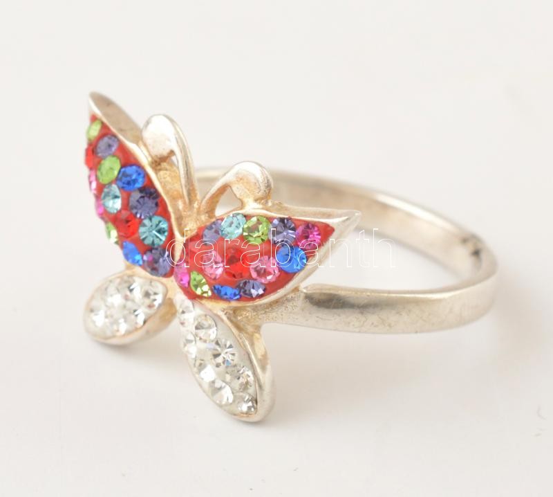 Ezüst(Ag) apró színes kövekkel díszített lepkés gyűrű, jelzett, bruttó: 3,9 g