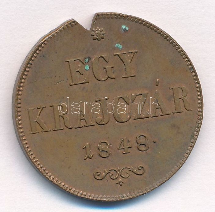 https://www.darabanth.com/en/359-Online-auction/359.0/Numismatics/Hungarian-coins-and-coins-with-Hungarian-mint-marks~2000008/1848-1kr-Cu-T2-szelebol-kivagott-resz-Adamo-B1~II2065968