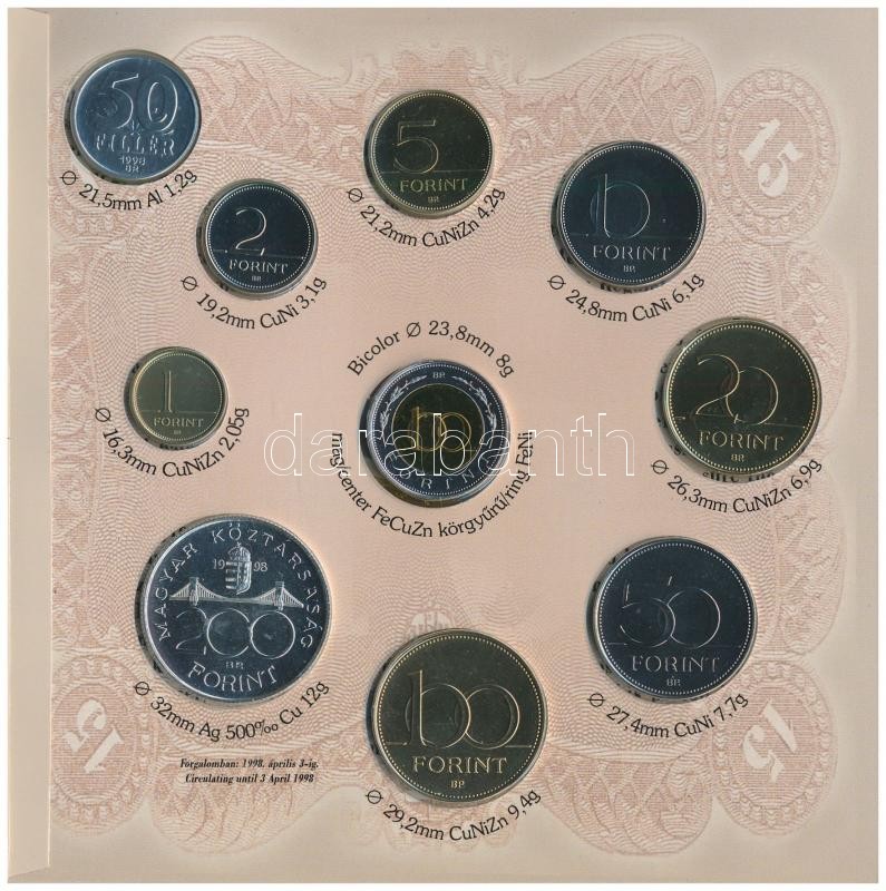 https://www.darabanth.com/en/359-Online-auction/359.0/Numismatics/Hungarian-coins-and-coins-with-Hungarian-mint-marks~2000008/1998-50f-200Ft-10xklf-forgalmi-sor-disztokban-plus-1998-100Ft-alpakka-1848-1849-Szabadsagharc-1~II2058691