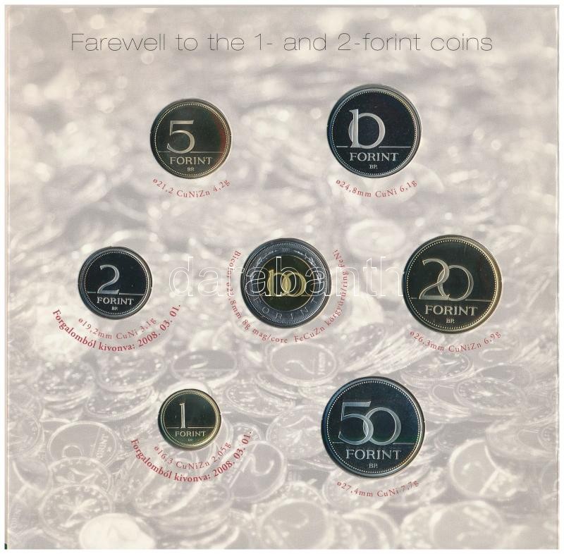 https://www.darabanth.com/en/359-Online-auction/359.0/Numismatics/Hungarian-coins-and-coins-with-Hungarian-mint-marks~2000008/2008-1Ft-100Ft-7xklf-darabos-forgalmi-sor-Bucsu-az-egy-es-ketforintostol-disztokos-szett~II2063768