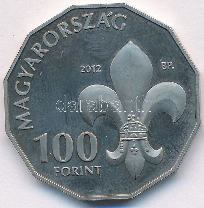 https://www.darabanth.com/en/359-Online-auction/359.0/Numismatics/Hungarian-coins-and-coins-with-Hungarian-mint-marks~2000008/2012-100Ft-Cu-Ni-100-eves-a-Magyar-Cserkeszszovetseg-T1-eredetileg-PP~II2050173