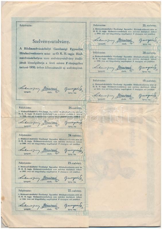1927. "Hódmezővásárhelyi Gazdasági Egyesület Hitelszövetkezete" részjegye 20P-ről, szelvényekkel, szárazpecséttel T:III